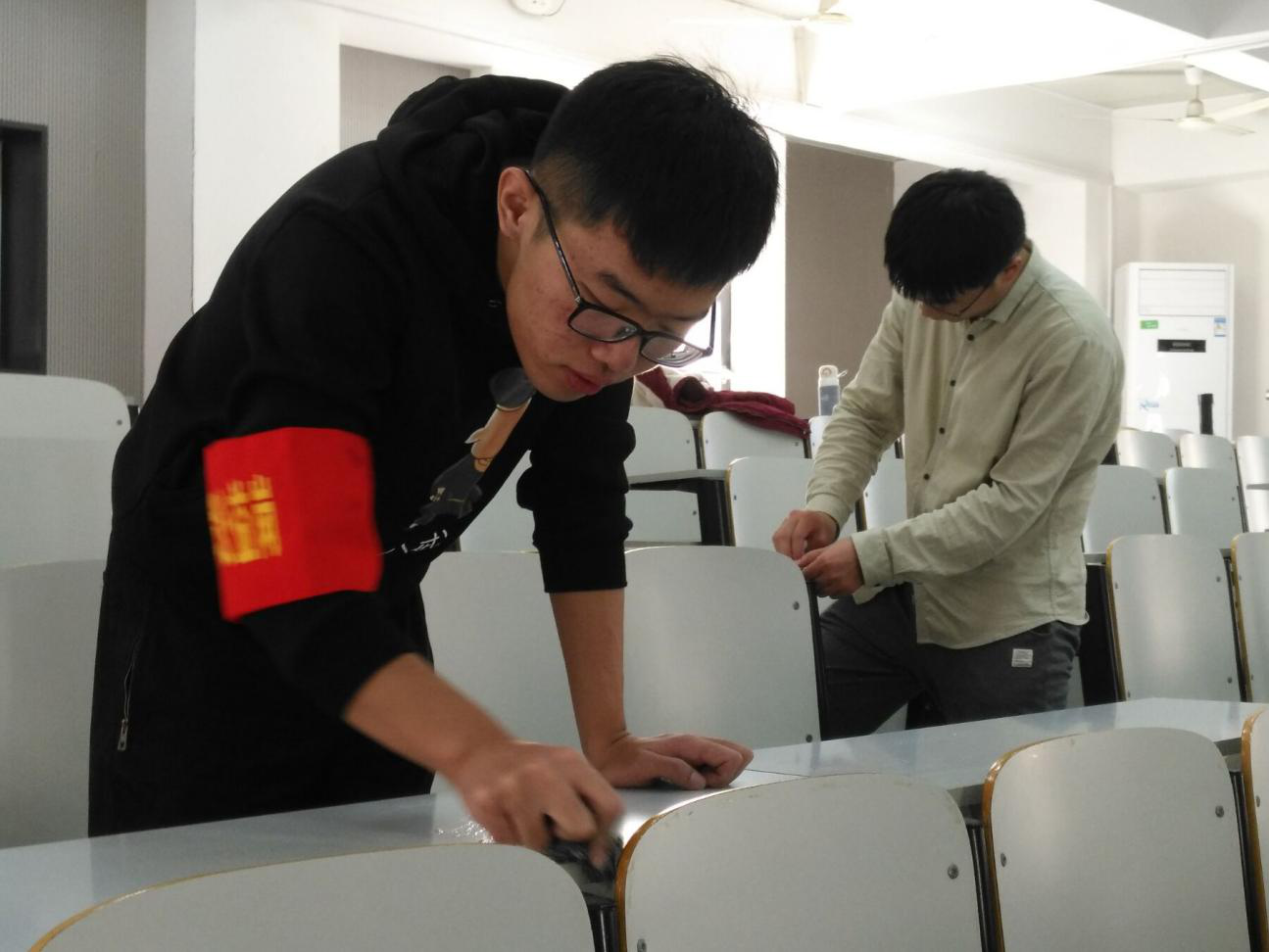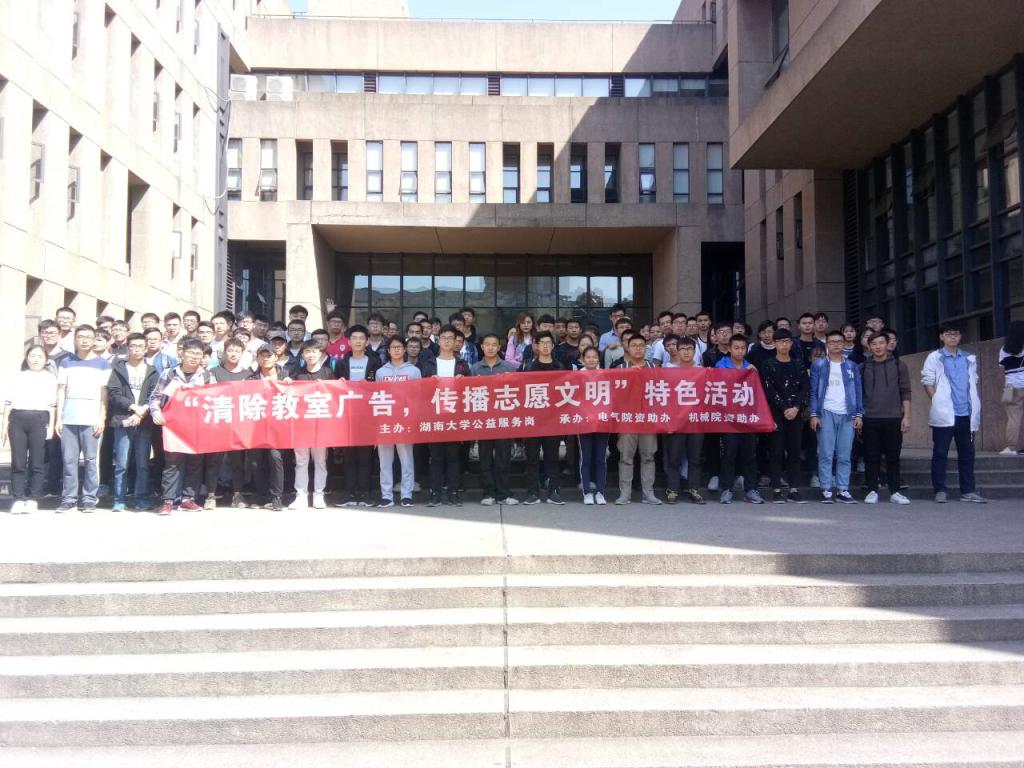 与电气院公益岗志愿者们在综合楼进行“清除教室广告,传播志愿文明”特色活动。此次联合活动不仅增进两院的感情,也为湖南大学众多学子营造了一个更干净整洁的教室环境,更提升了校园形象,增强了广大学生热爱劳动的意识。