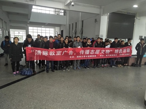 2018年12月10日,由机械院与电气院文明公益岗共同组织的第二次“清除教室广告,传播志愿文明”活动在湖南大学复临舍顺利开展。此次活动继续秉承“创造美好校园,增强服务意识”的活动宗旨,通过志愿服务活动培养志愿者服务社会、感恩学校的情怀。