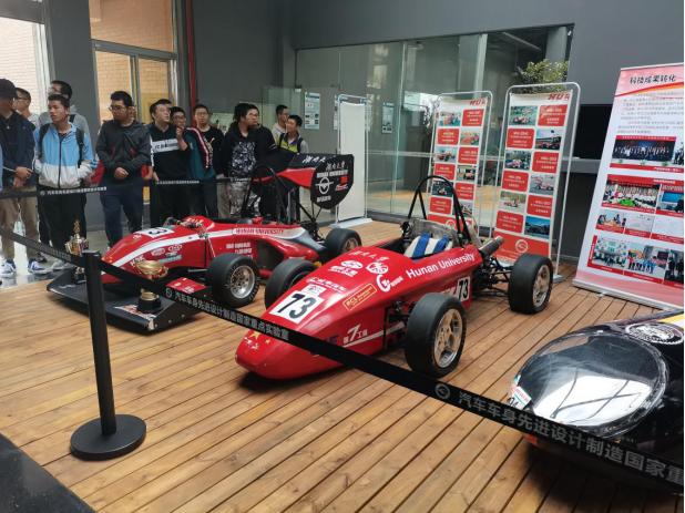 最后的重磅是参观湖大赛车队的赛车,我校电动方程式赛车队荣获2019赛季“蔚来杯”中国大学生电动方程式大赛的冠军。在此次比赛中,我校还取得了最快车检奖第二名、营销答辩第四名、成本答辩第三名、直线加速第三名、耐久测试第五名、电池箱设计第二名、轻量化第一名等奖项,共赢得奖金约472000元。