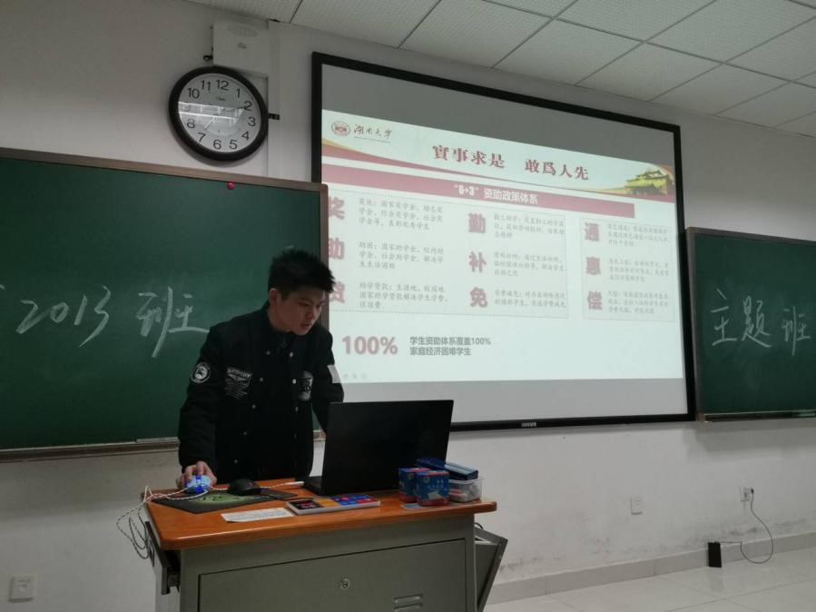 接下来,班长先讲解了我校学生资助政策的具体内容,将“6+3”资助政策体系展示给同学们研读。通过这部分介绍让大家明白了湖南大学对社会的庄严承诺:不让一名学生因家庭经济困难而失学,让每位学生共同享有人生出彩、梦想成真的机会!
