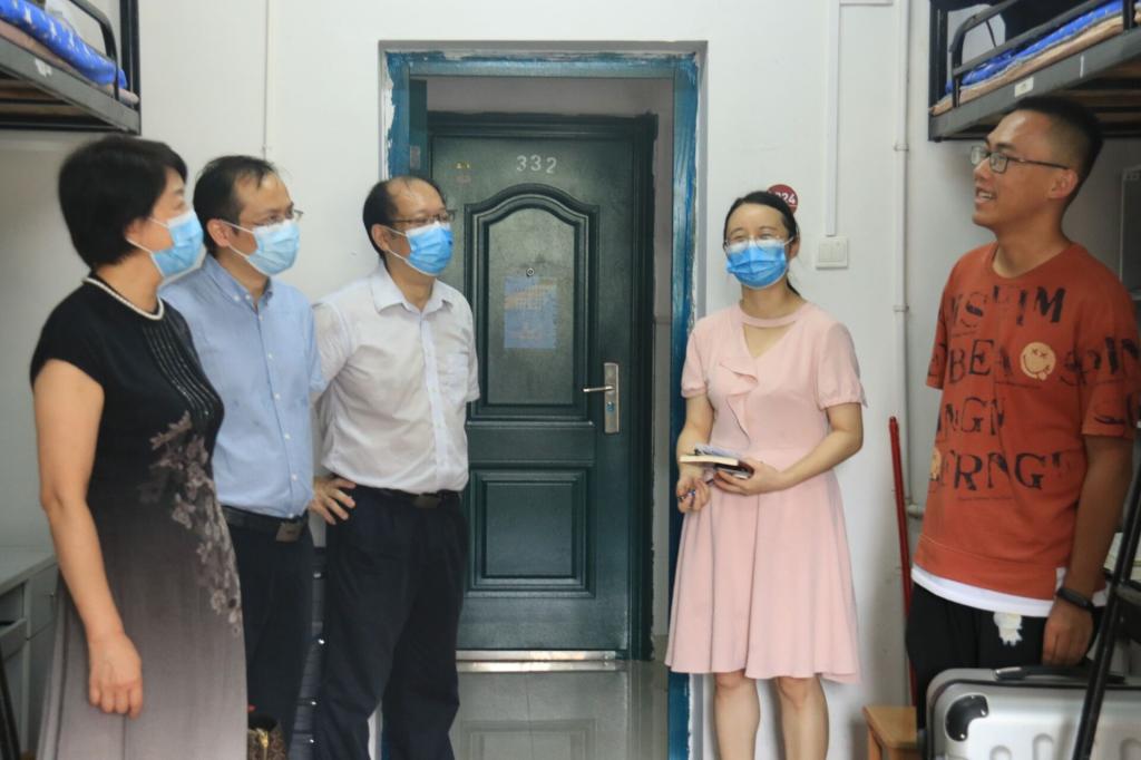 党委书记彭晓燕老师,党委副书记周加喜老师,党委副书记易洪波老师,院长助理龙湘云老师走进学生公寓,为刚入学的新生送去关怀与温暖。