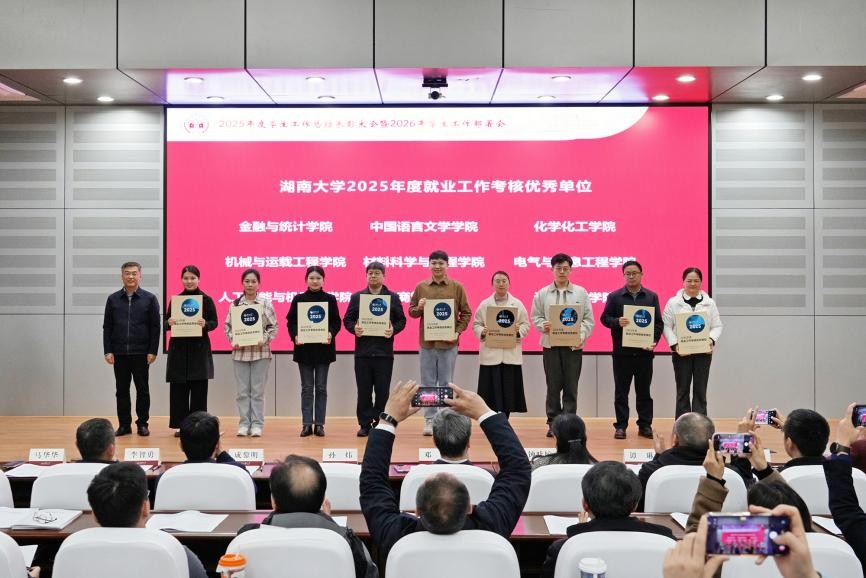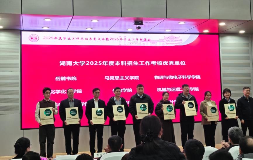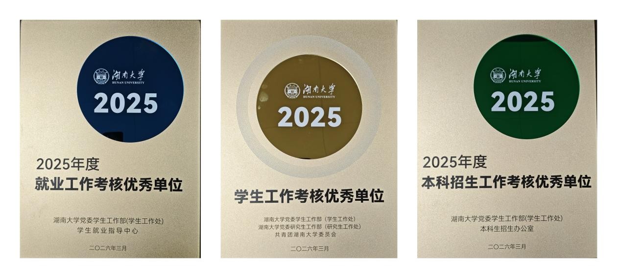 在此次表彰大会上斩获多项荣誉,成绩斐然。学院成功获评湖南大学2025年度学生工作考核优秀单位、2025年度本科招生工作考核优秀单位、2025年度就业工作考核优秀单位三项集体荣誉,充分彰显了学院在学生工作全链条中的扎实成效与突出实力。同时,学院辅导员张骏、王玉迪获评湖南大学2025年度“学生工作先进个人”,展现了新葡京娱乐场