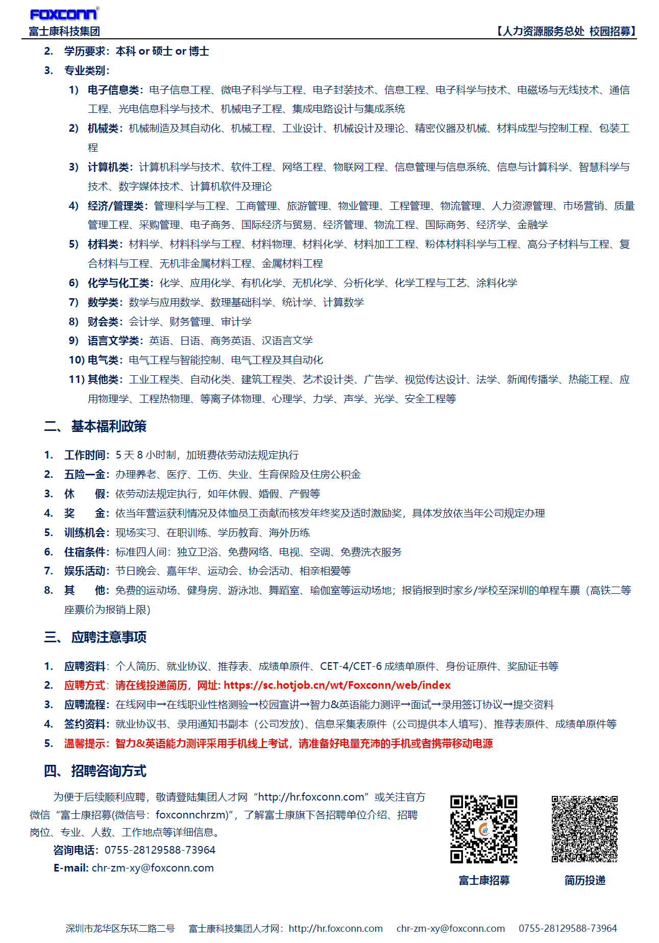 富士康注重培育科技人才、创新发展模式,一直保持快速成长势头。以“长期、稳定、发展、科技、国际”为经营宗旨。秉持“人才本土化、人才科技化、人才国际化”的人才策略,每年向各类院校招募德才兼备的人才,在工作历练、教育训练、选拔晋用等方面给人才以宽广的舞台。
