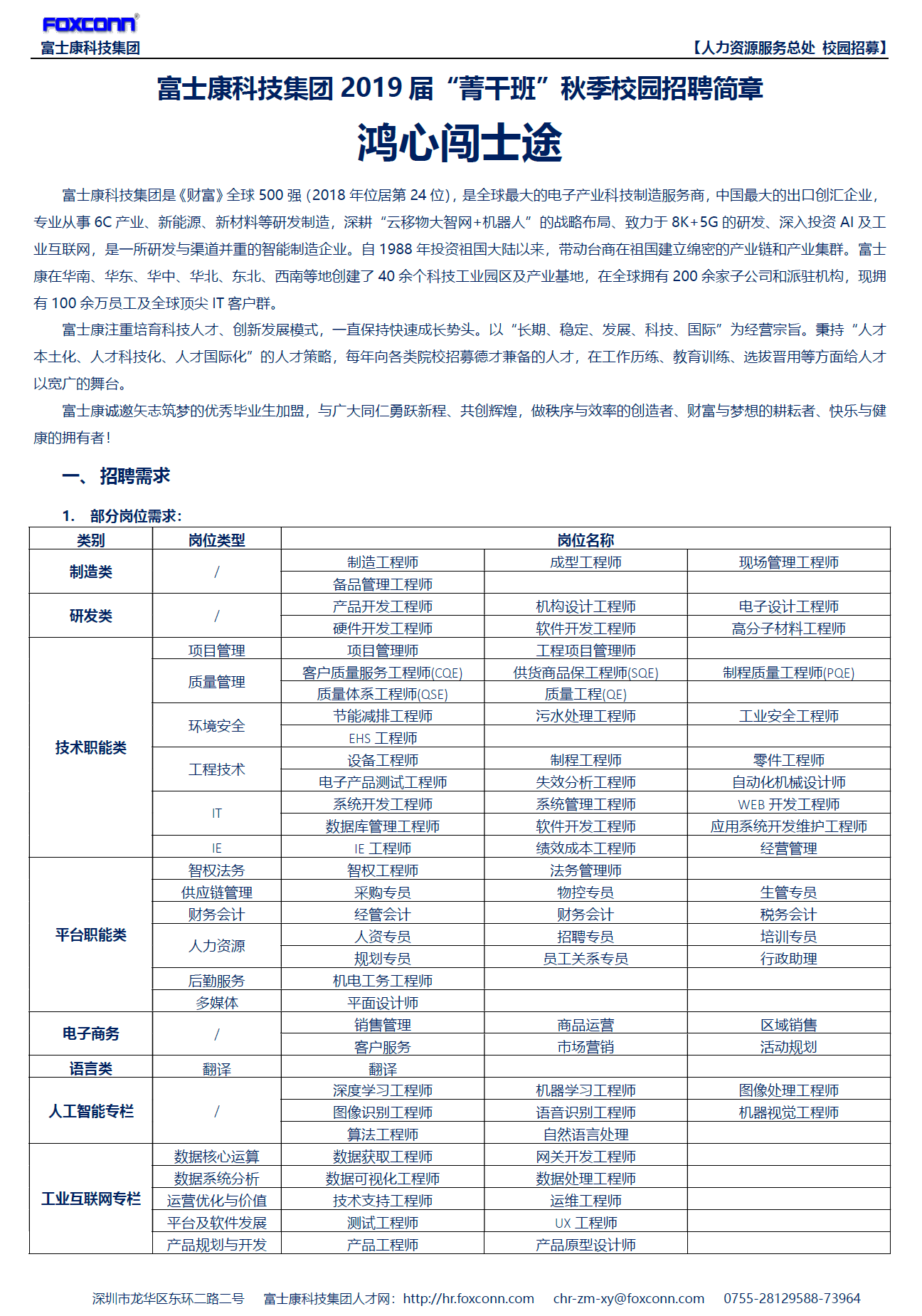 富士康科技集团是《财富》全球500强(2018年位居第24位),是全球最大的电子产业科技制造服务商,中国最大的出口创汇企业,专业从事6C产业、新能源、新材料等研发制造,深耕“云移物大智网+机器人”的战略布局、致力于8K+5G的研发、深入投资AI及工业互联网,是一所研发与渠道并重的智能制造企业。自1988年投资祖国大陆以来,带动台商在祖国建立绵密的产业链和产业集群。富士康在华南、华东、华中、华北、东北、西南等地创建了40余个科技工业园区及产业基地,在全球拥有200余家子公司和派驻机构,现拥有100余万员工及全球顶尖IT客户群。